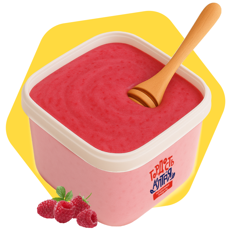 Крем-мёд с малиной — это нежный взбитый мёд с ярким натуральным вкусом малины. Основой служит высококачественный цветочный мёд из Алтайского края, прошедший щадящую холодную стабилизацию. Ягода добавляется в виде пюре, порошка или кусочков сушёной малины — в зависимости от партии.
